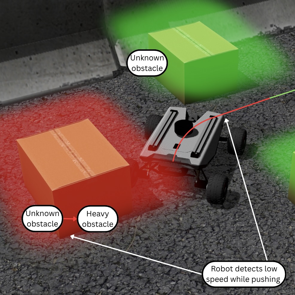 The Slow-Pose Progress Checker monitors the ratio between commanded and actual velocity using odometry data. When the robot slows or stalls while pushing an object, it publishes messages that elevate nearby obstacle costs from light to heavy or lethal, prompting replanning and recovery behaviors.